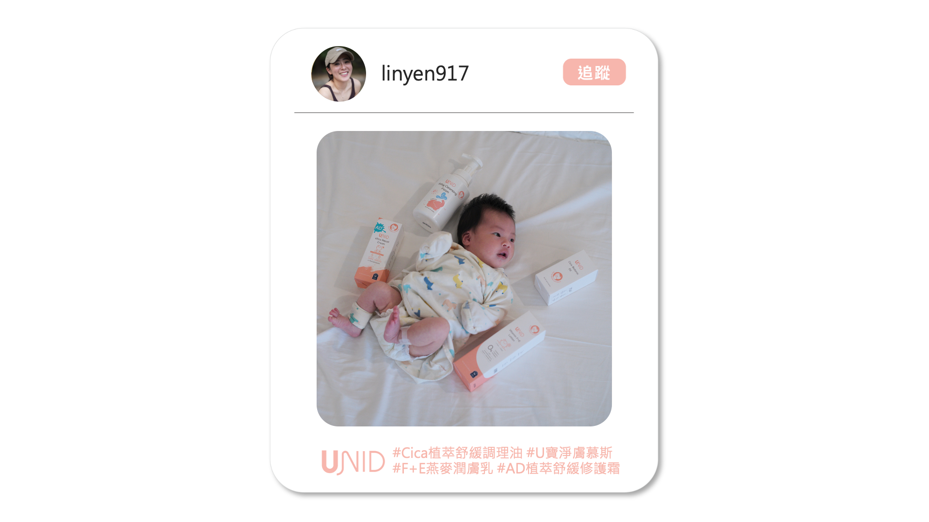 目前寶寶使用的許多產品也都是 @unid.skincare 系列,UNID有多樣產品通過美國FDA認證實驗室人體臨床證實無刺激,乳液、乳霜更榮獲美國國家濕疹協會認證,堅持六大無添加原則: 無類固醇、無防腐劑 、無石化礦物油、無合成香料、無色料、無酒精的「醫美級的母嬰保養品牌」。